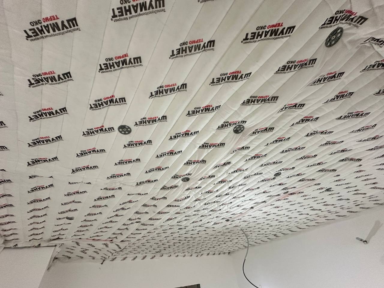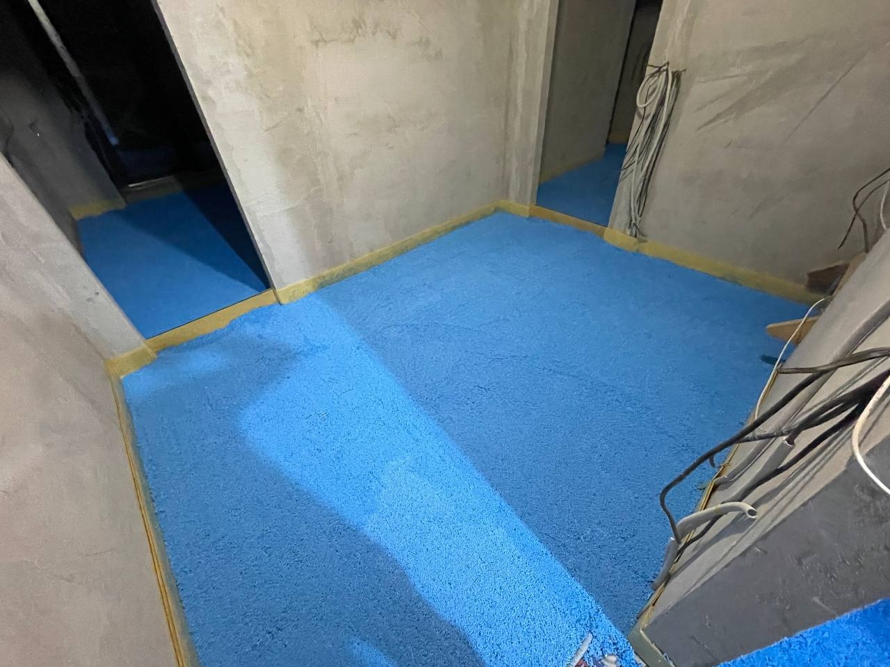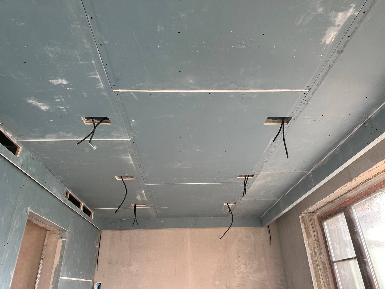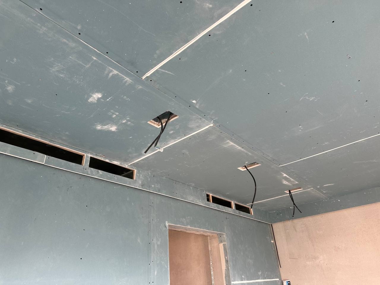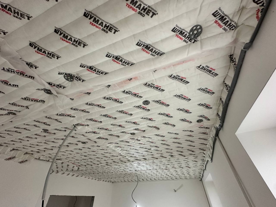 Для звукоизоляции стен использовались каркасные решения на виброизолирующих подвесах Виброфлекс, а также Soundline-dB, Aku-line и Шуманет. Потолок имел сложную форму, большое количество коммуникаций по потолку, ниши под встроенные софиты и подсветку, короба под освещение и многое другое. В качестве материала для пола был использован Шумопласт. Данное решение под стяжкой позволяет помимо отличной звукоизоляции ударного и воздушного шума выполнять выравнивание поверхности и укладку вместе с коммуникациями.